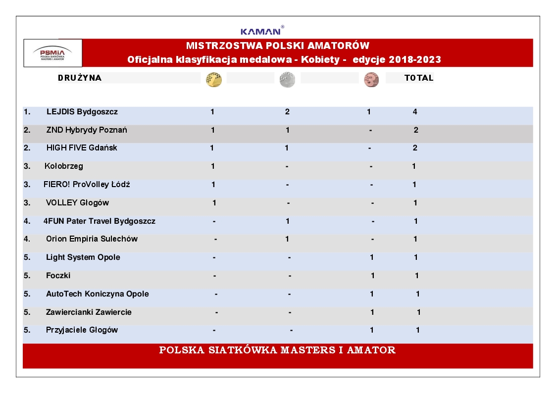 Lejdis Bydgoszcz, z czterema medalami, mimo braku zgłoszenia do walki o medale w edycji 2024 nie staci swojej dominującej pozycji w klasyfikacji medalowej MPA. Z pewnością zagrożone spadkiem w tabeli są Hybrydy Poznań, Kołobrzeg oraz Atol ProVolley Łódź występujące do dzisiaj w turniejach PSMiA oraz High Five Gdańsk oraz Volley Głogów których od kilku lat nie gościliśmy podczas naszych mistrzowskich wydarzeń polskiej siatkówki amatorskiej.
