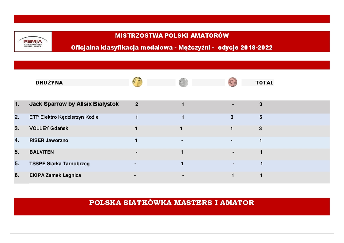 Po pięciu latach oficjalnych Mistrzostw Polski Amatorów po raz kolejny tworzymy mistrzowską klasyfikację medalową.