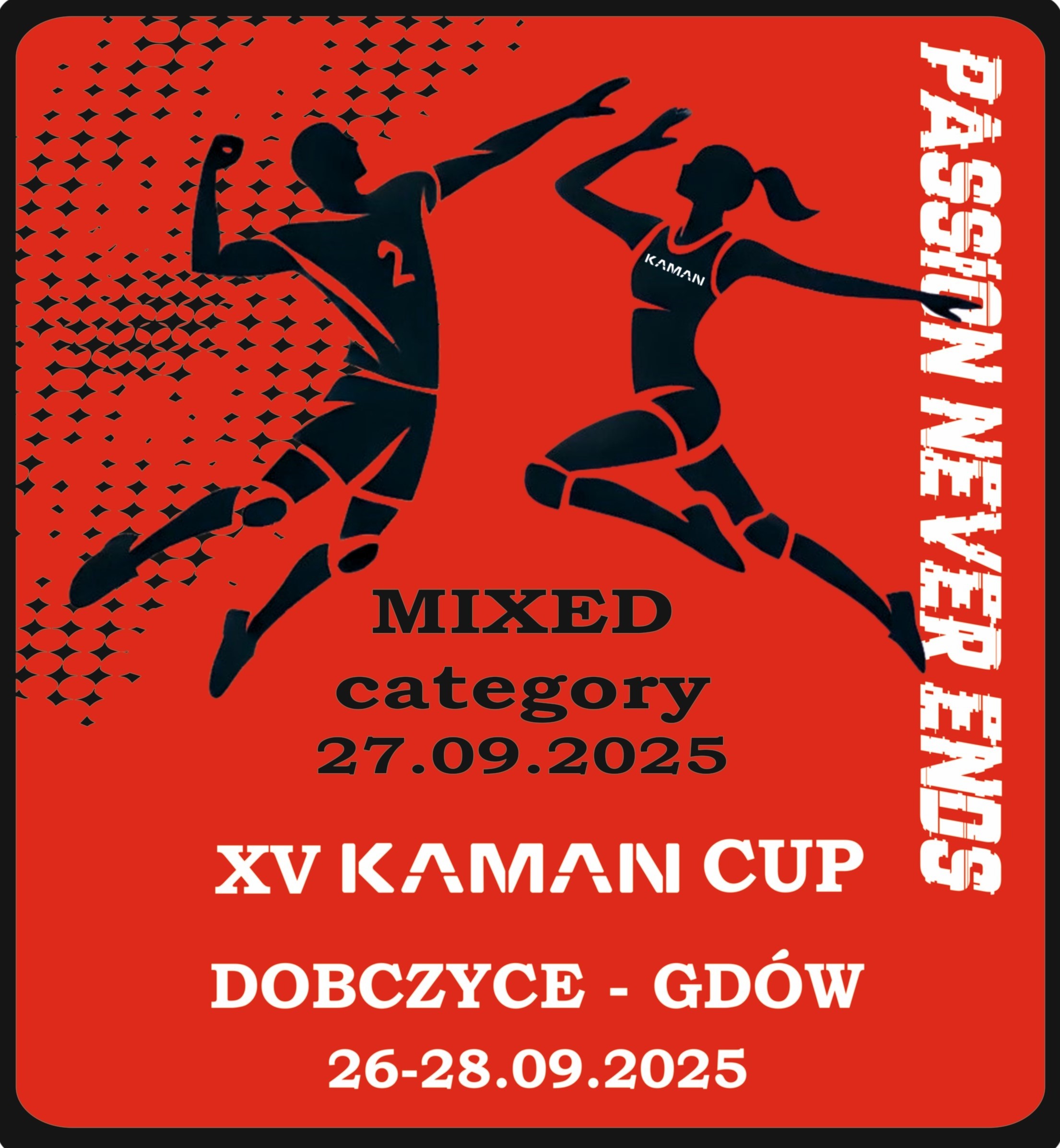 Sportowy plan XV Kaman Cup 26.28.09.2025 polega na rywalizacji w kategorii masters w dniach 26-27.09, rozgrywkach mikstów 27.09 oraz amatorów w dniach 27-28.09 z mozliwością rozegrania pierwszych meczów w dniu 26.09 ( piątek ) dla drużyn zadeklarowanych i zdecydowanych rozpocząć swoje święto siatkówki wcześniej.