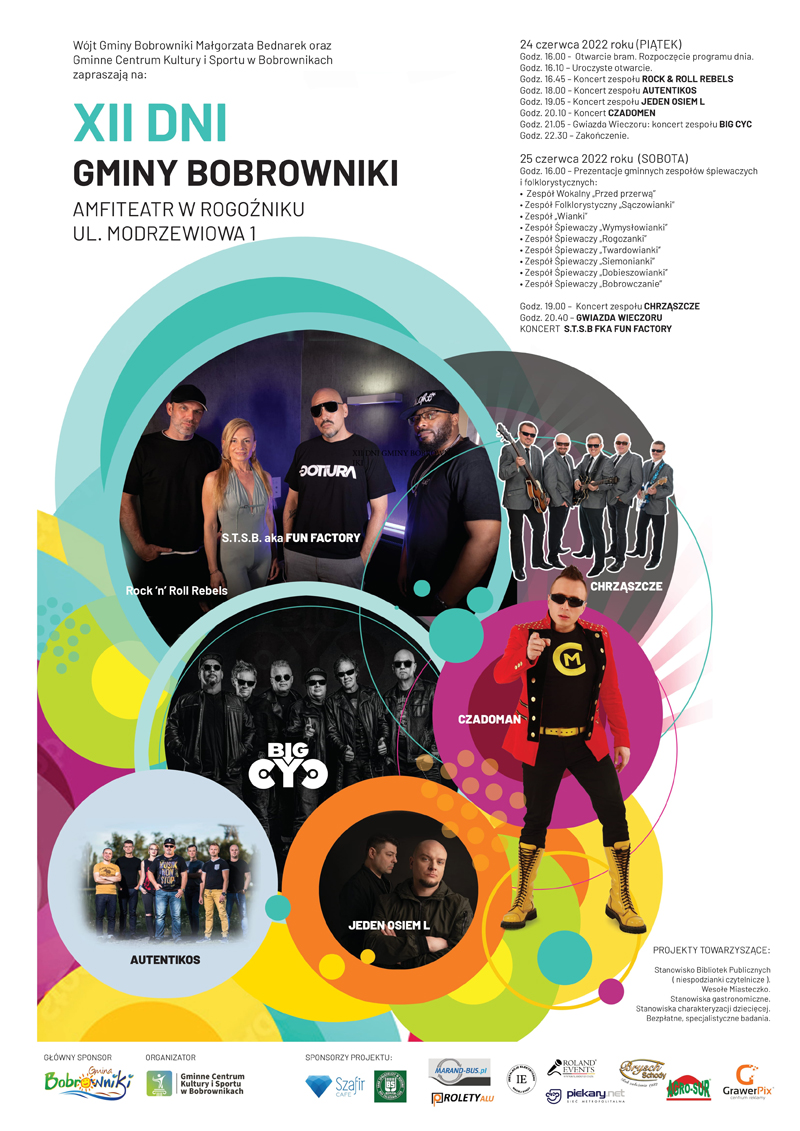 Wójt Gminy Bobrowniki Pani Małgorzata Bednarek oraz Gminne Centrum Kultury i Sportu w Bobrownikach zapraszają na XII Dni Gminy Bobrowniki które odbędą się w Amfiteatrze w Rogoźniku.