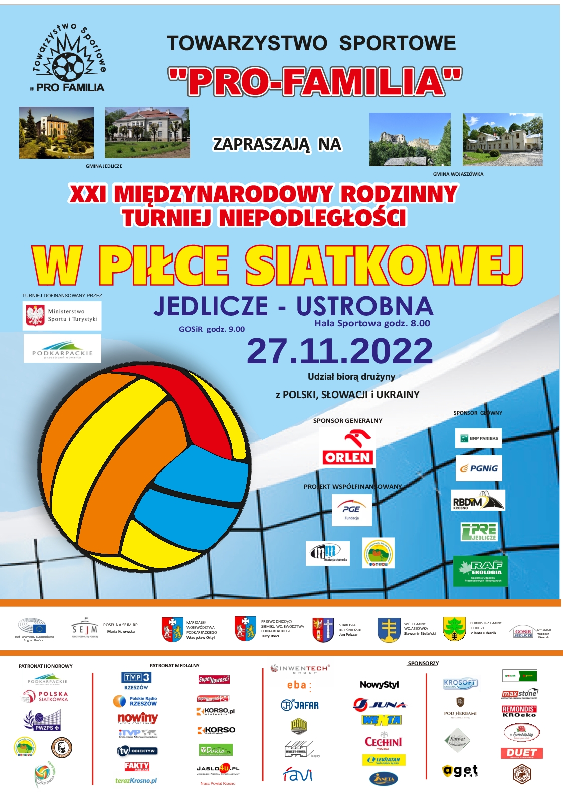 27 listopada 2022 r. w Jedliczu i Ustrobnej odbędzie się kolejny XXI Międzynarodowy Rodzinny Turniej Niepodległości w Piłce Siatkowej PRO-FAMILIA CUP 2022. Komunikat organizacyjny i szczegóły poniżej.