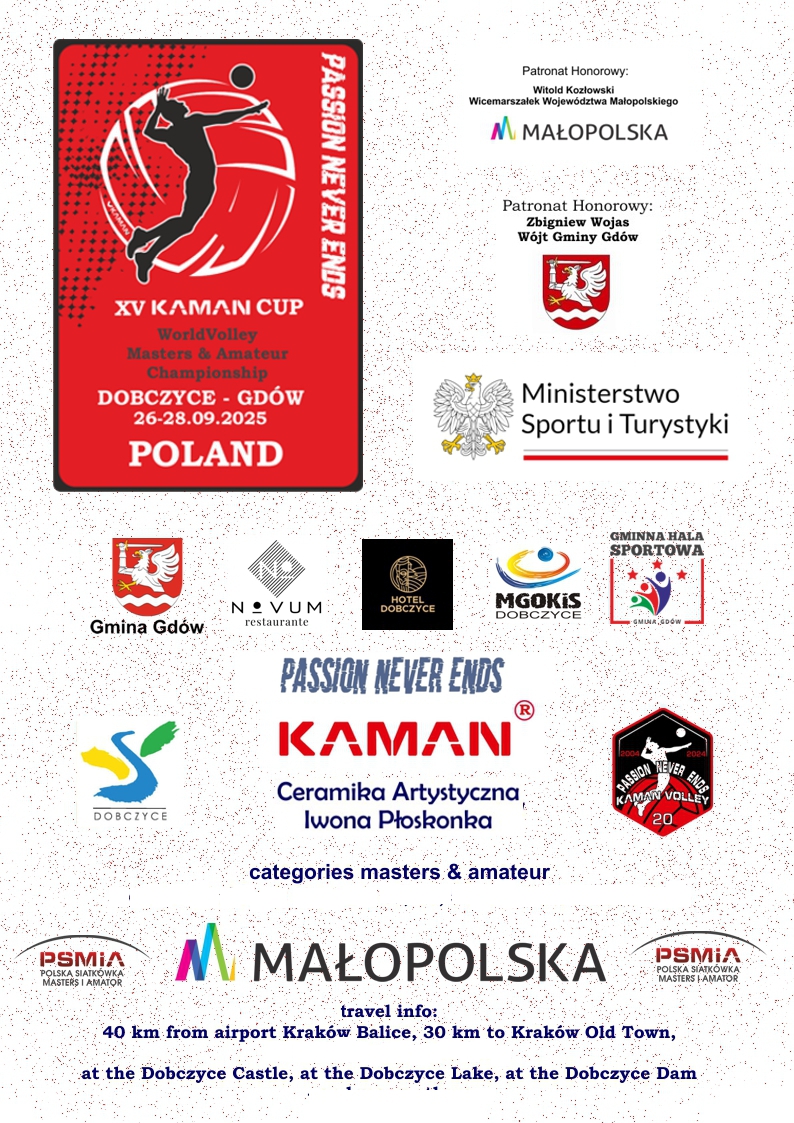 Już w ten weekend 26-28.09 w Gmina i Miasto Dobczyce i Gmina Gdów odbędzie się XV edycja Kaman Cup - siatkarskiego święta w siatkówce masters i amator.